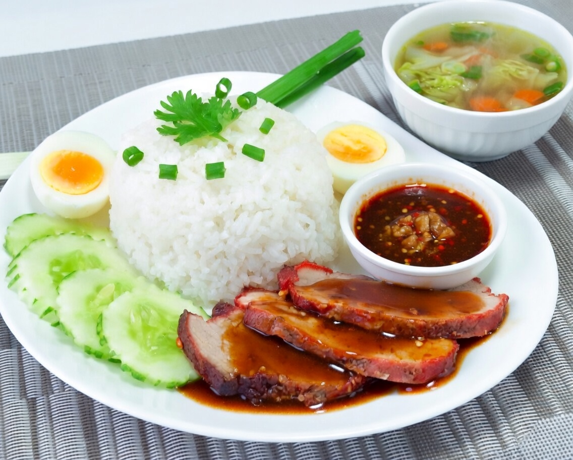 1 Khao Moo Daeng is a Thai BBQ pork dish served with rice, crispy pork, and egg. It provides a good source of protein and energy, while the balanced combination of meat and rice makes it a satisfying and filling meal.